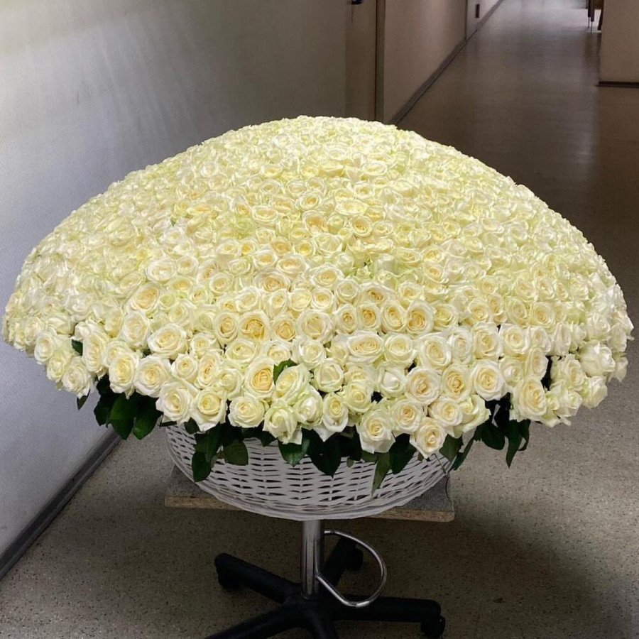 На фото 1001 белая роза в корзине «чистота». В составе: роза 1001 шт, корзина (xl) 1 шт, оазис флористический 27 шт, . Все цветы свежие и ароматные, букет красиво оформлен и отлично подходит для подарка. Доступна доставка цветов или самовывоз.