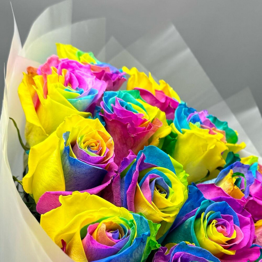 Лента атласная - 3 шт. Кризал (подкормка) - 1 шт. Открыточка с вашими пожеланиями - 1 шт. Дизайнерская упаковка - 1 шт. радужные розы - 15 шт.